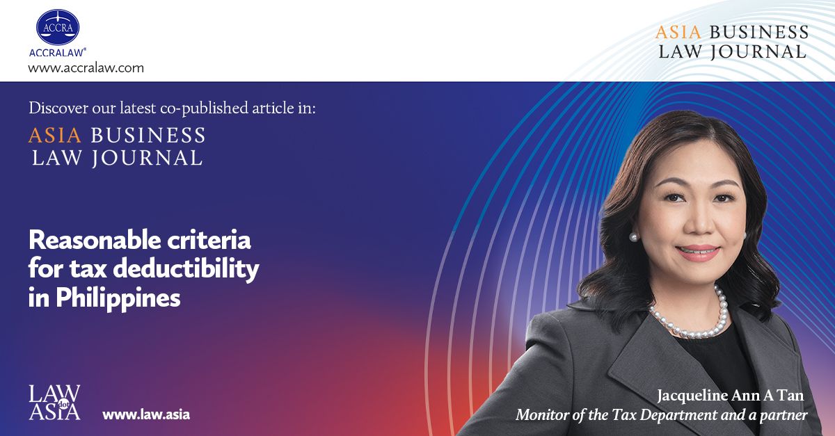 ACCRALAW Partner Jacqueline Ann A. Tan was featured in Asia Business Law Journal for authoring “Reasonable criteria for tax deductibility in Philippines”.