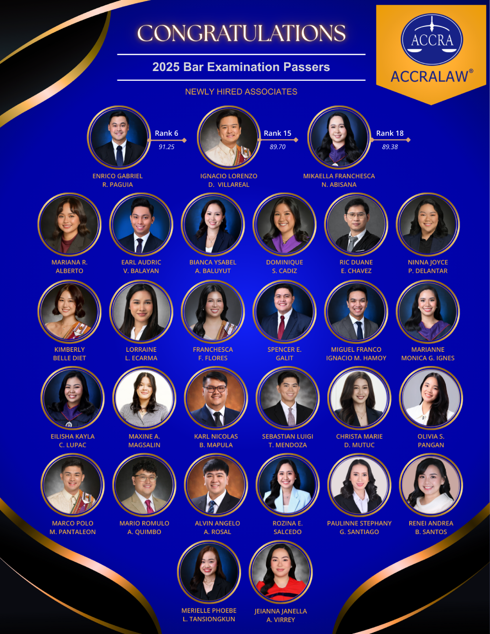 Mr. Paguia, Mr. Villareal, and Ms. Abisana, Associates from the Firm’s Litigation and Dispute Resolution Department, placed 6th, 15th, and 18th, respectively. Mr. Paguia received a score of 91.25%, while Mr. Villareal and Ms. Abisana obtained 89.70% and 89.38%, respectively.
