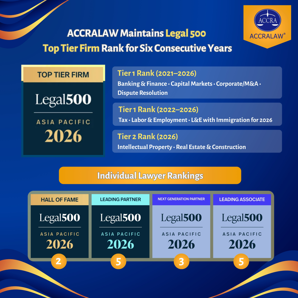 ACCRALAW has maintained its Legal 500 Tier 1 rank for six consecutive years (2021–2026) in the following practice areas: Banking & Finance, Capital Markets, Corporate/M&A, and Dispute Resolution.