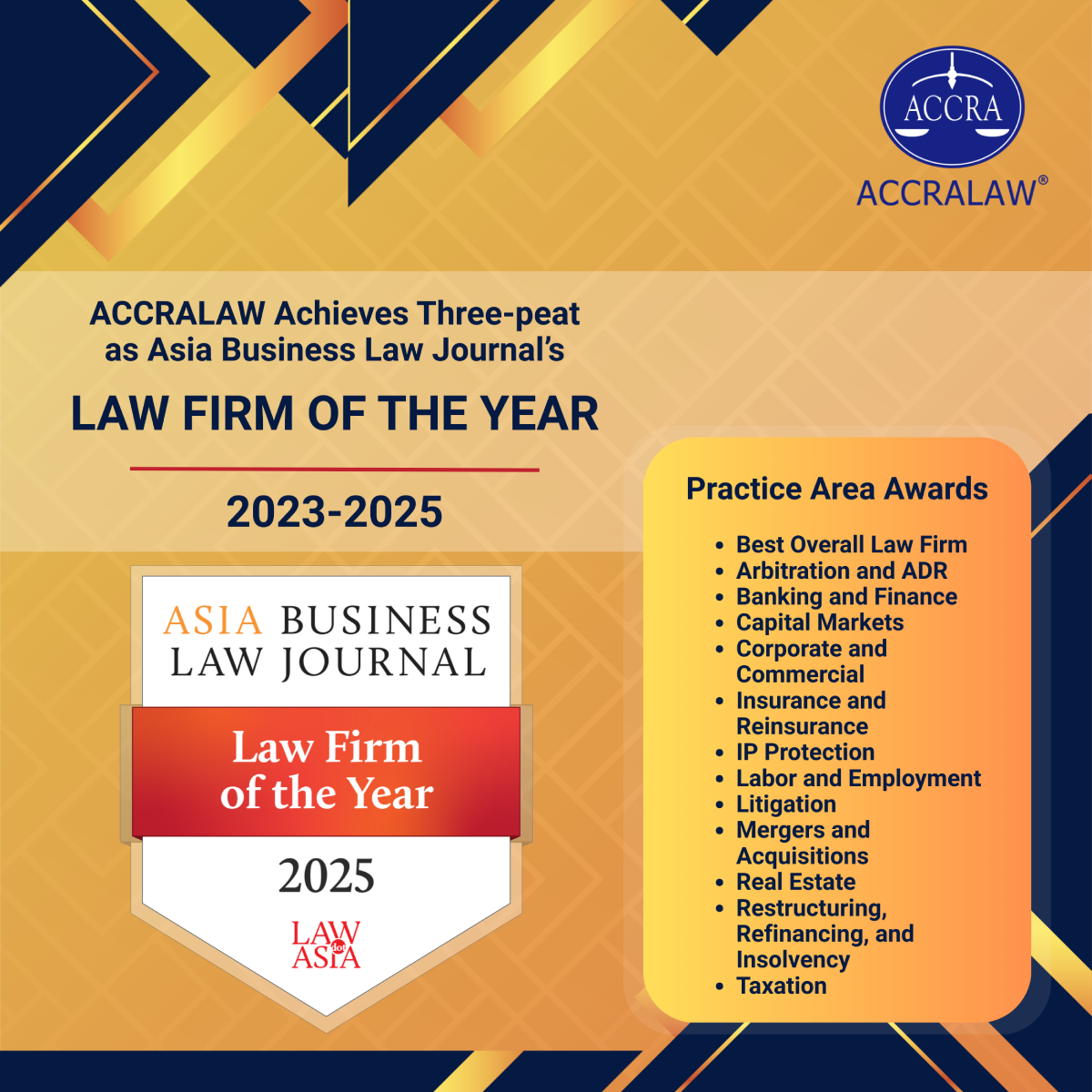 12 January 2026 — ACCRALAW has been recognized as Law Firm of the Year for the third consecutive year by the pan-Asian legal publication Asia Business Law Journal (“ABLJ”) in its 2025 Philippines Law Firm Awards. The Firm was also ranked in the following categories: