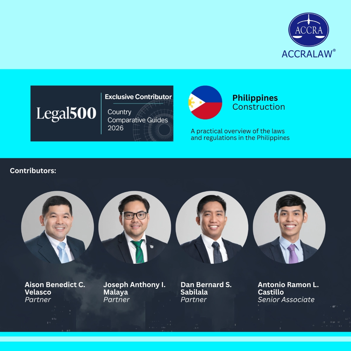 ACCRALAW contributed the Philippine chapter of Legal 500’s Country Comparative Guide on Construction for 2026. The chapter was authored by Partners Aison Benedict Velasco, Joseph Anthony Malaya, and Dan Bernard Sabilala, and Senior Associate Antonio Castillo.