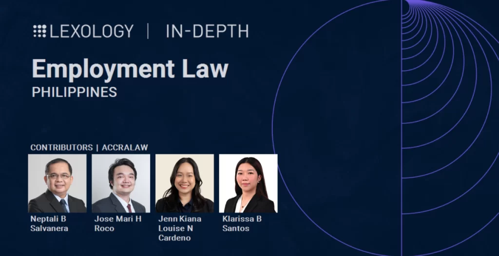 ACCRALAW is delighted to have been invited as the exclusive contributor in the Philippines to the Lexology In-Depth: Employment Law – Edition 16, published by Lexology on 26 December 2025. The chapter Employment Law: Philippines was authored by Partner Neptali B. Salvanera, Senior Associate Jose-Mari H. Roco, and Associates Jenn Kiana Louise N. Cardeño and […]